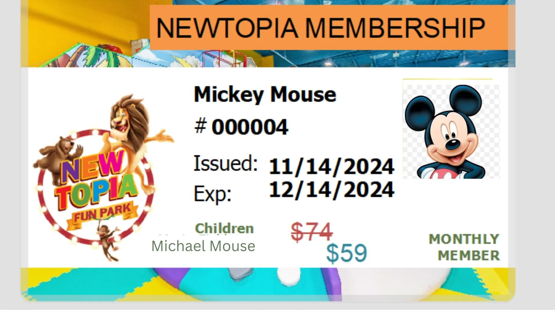 For one month, you will have visits available to the Newtopia Fun Park location paid for YOUR family! Only members listed on the card will be able to visit. The card's expiration will require another renewal or you may upgrade to another package. Offer only valid for one adult and one child